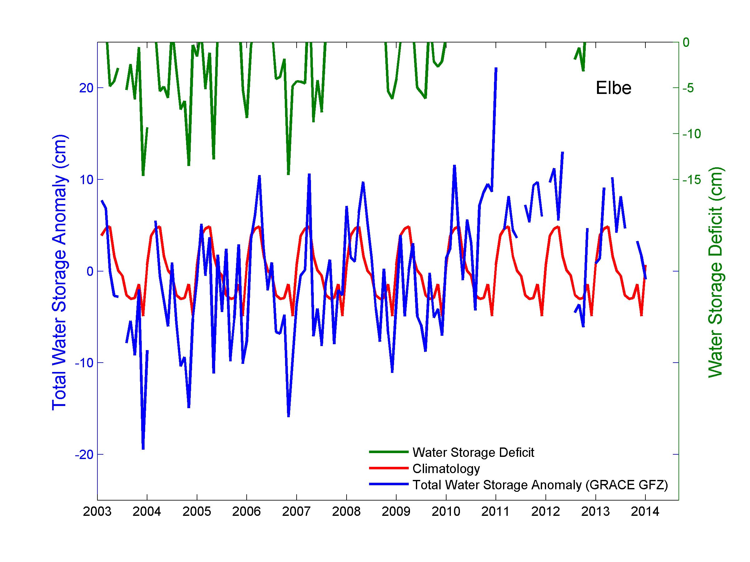Figure 1 – GRACE-observed water storage anomalies and deficits for the Elbe river basin. Blue line: spatial average storage anomaly, red line: monthly climatology, and green line: water storage deficit.