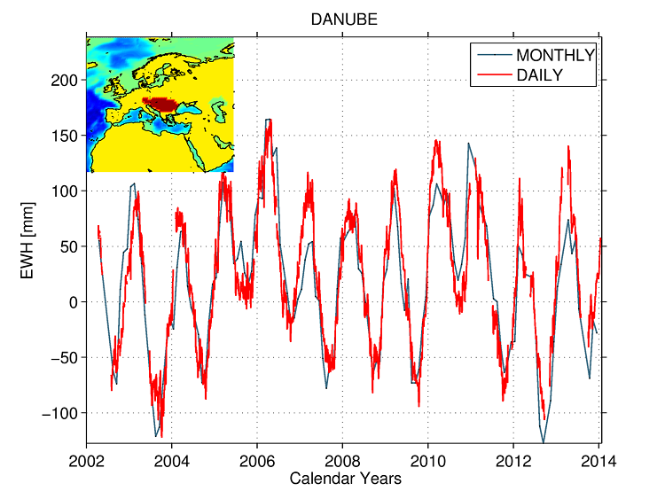Tests of the daily grids that will be conducted in the following weeks comprise GPS permanent station loading coherence, correlations in hydrological basins with available hydrological models, comparisons of individual spherical harmonic coefficients (e.g. degree 2) with respective SLR time-series and comparisons to in-situ ocean bottom pressure recorder data. For selected individual catchments aggregated values are generated and compared to specific river discharge and flow volume estimates.