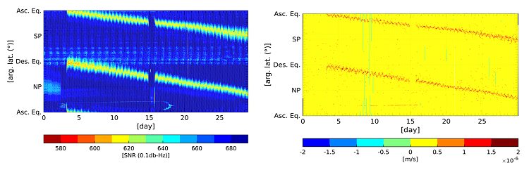 Figures 1 and 2(left) are showing the SNR errors due to low temperature. In Fig. 2(right), we show their impact on high frequency range-rate residuals for the test month of August 2007.