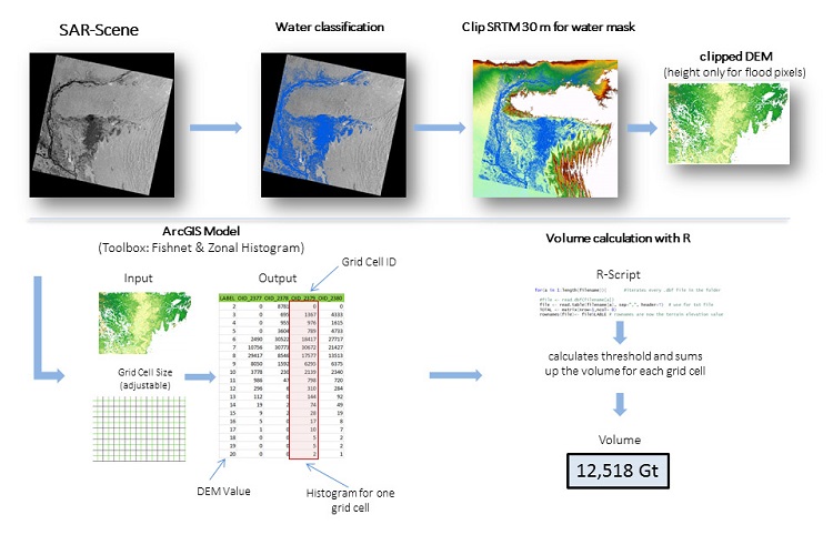 In order to compare gravity measurements from space with flood information derived from earth observation satellites, a workflow for flood volume calculation based on the combination of SAR scenes during a flood and a digital elevation model (DEM) has been developed.