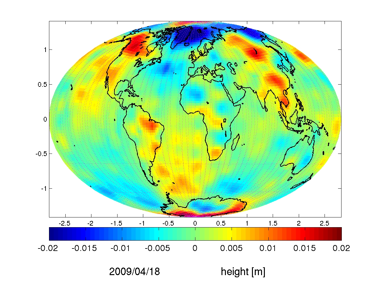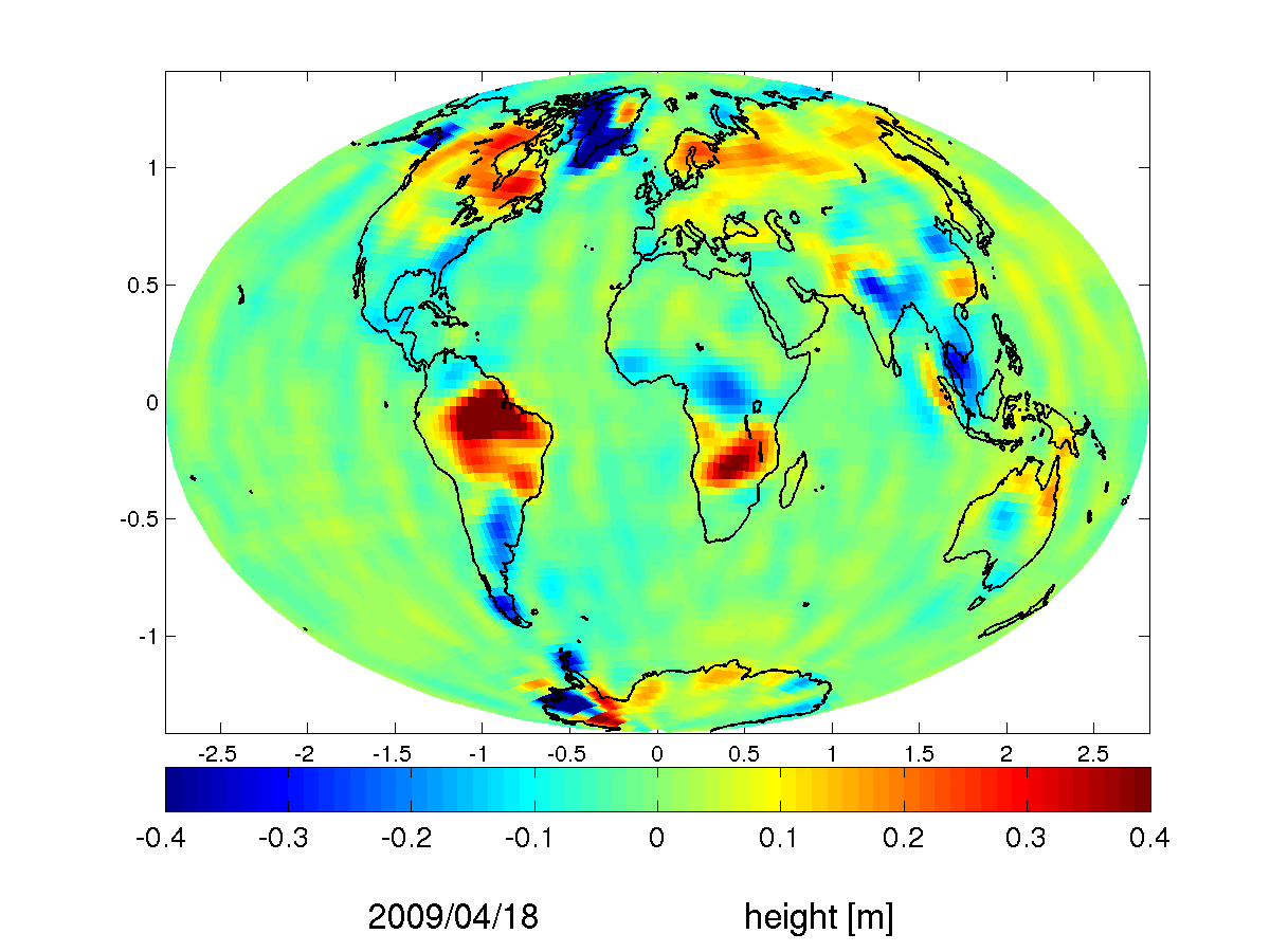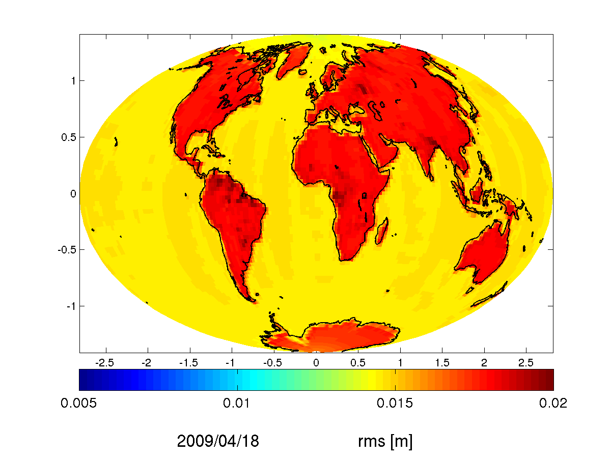 Note the separation of land-ocean since the GRACE Level-1B Atmosphere and Ocean de-aliasing Model (AOD1B) signal has been subtracted from the observed accelerations and corresponding a-priori error covariances for continental hydrology are included in the Kalman-update.