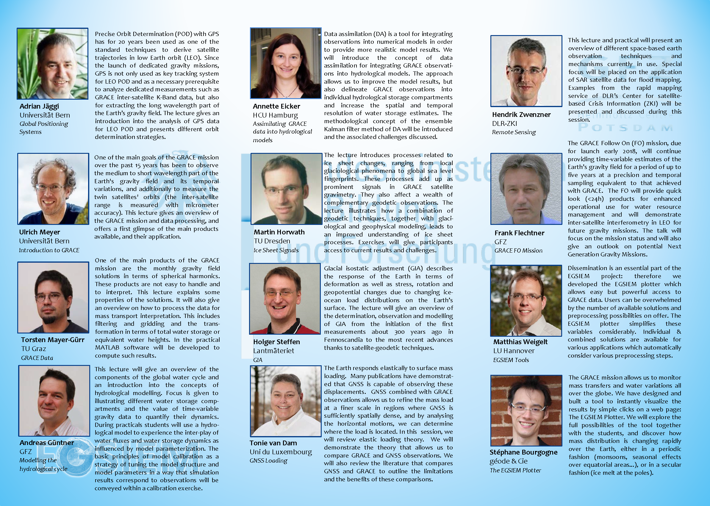 The Autumn School took place between Monday 11. and Friday 15. September at the beautiful and historic Telegrafenberg site in Potsdam, Germany. The EGSIEM team would like to thank all those who attended (including the lecturers) and also the support staff at GFZ, without whom the event could not have taken place.